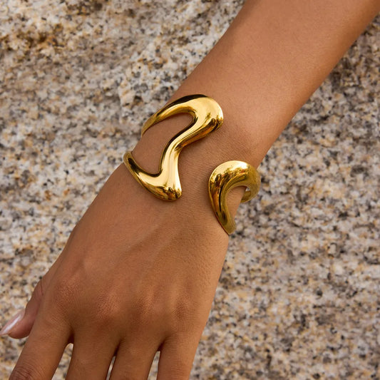 Women's Style - Minimalist Design / 18K Gold Stainless Steel / Line Double Layer Hollow Asymmetric Wave Open Bracelet