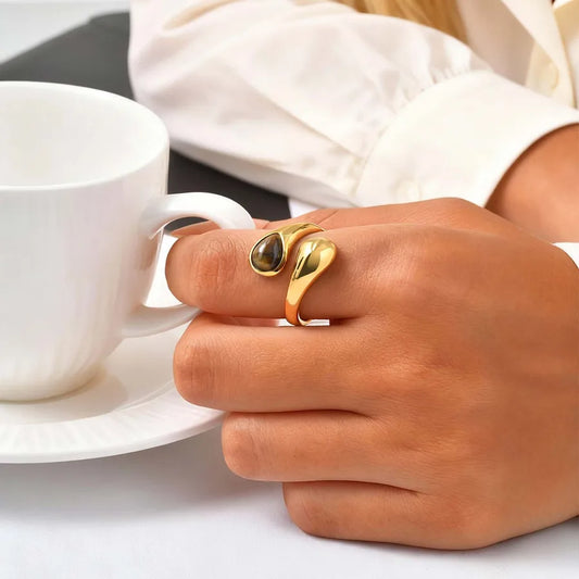 Women's Fashion Jewelry 201 Stainless Steel Vacuum Electroplated 18K Real Gold Geometric Pattern Water Drop Tiger Eye Stone Ring Gold