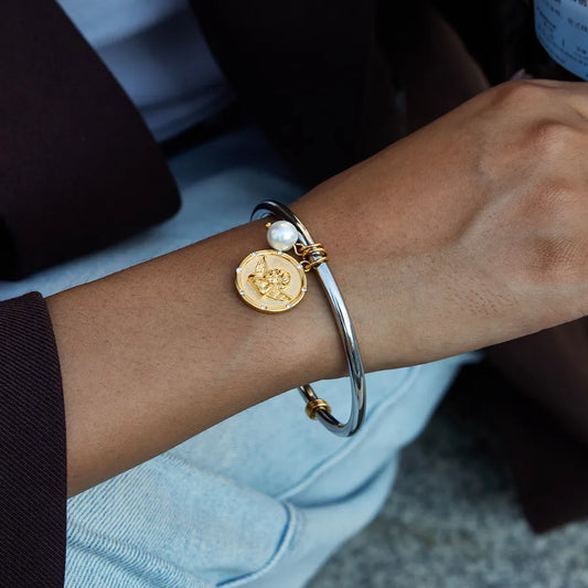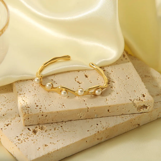 Elegant Vintage Style Geometric Stainless Steel 18K Gold Plated Artificial Pearls Bangle In Bulk