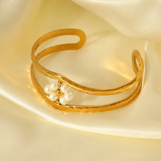 Elegant Stainless Steel Hollow Pearl Bracelet Open Flower Design Titanium Steel Jewelry For Women