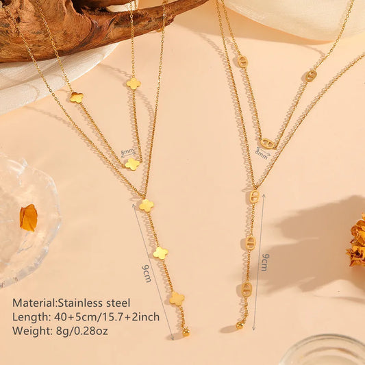 Trendy Stainless Steel Ladies Necklace Double Layer Tassel Versatile Simple Luxury Four Leaf Clover Pig Nose Design Jewelry Accessory