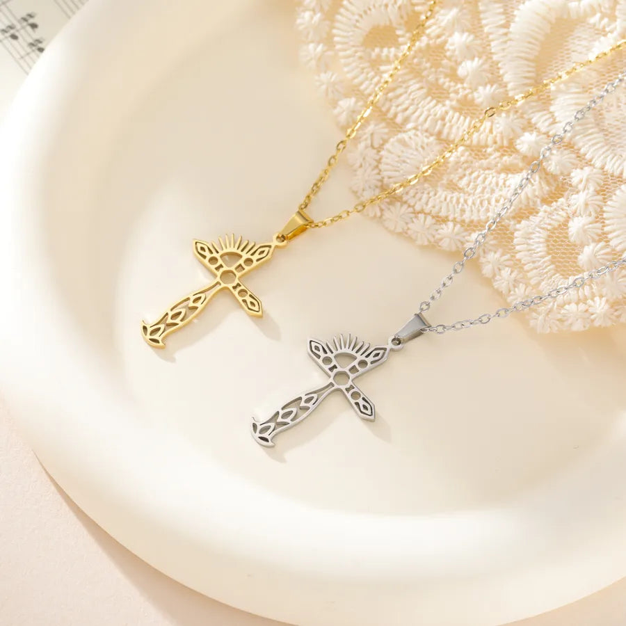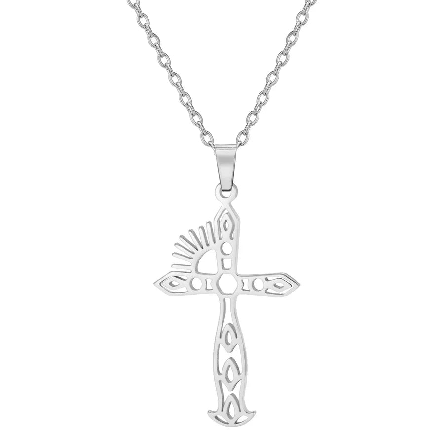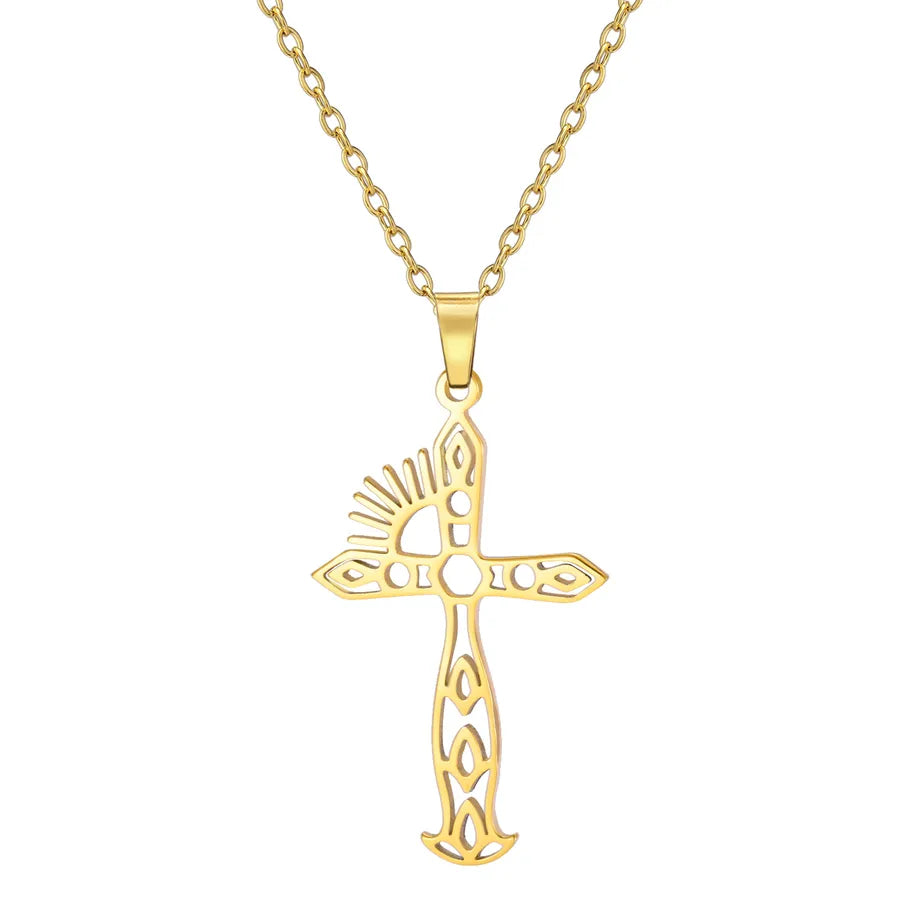 Fashionable Simple Stainless Steel 304 Sun Cross Pendant Necklace Unisex Stylish Geometry Pattern Jewelry Accessory