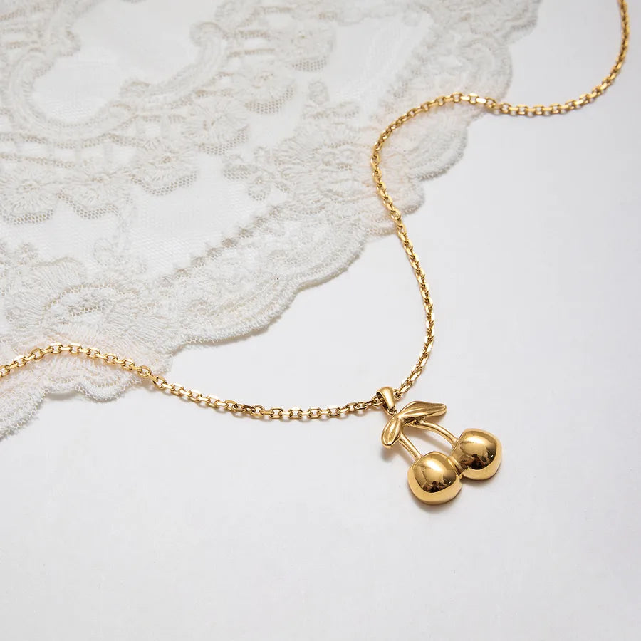 Sweet Romantic Cherry Pendant Necklace For Ladies 18K Gold Plated Stainless Steel 45+5cm Chain Jewelry Fruit Theme Accessory